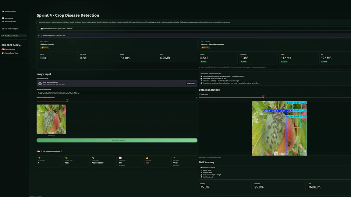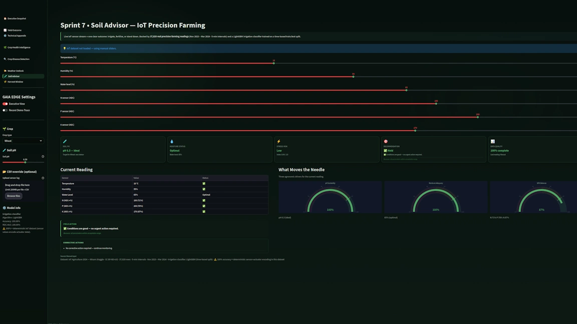 Gaia Edge is an end-to-end AI precision farming platform engineered for real-time agricultural intelligence at the edge. Across eight focused sprints, we built a vertically integrated system that spans crop yield prediction, disease detection, soil health monitoring, harvest intelligence, and weather-driven risk modelling. Each capability is designed not as an isolated demo model, but as a connected decision pipeline — turning raw sensor, image, and weather data into actionable agronomic insights.