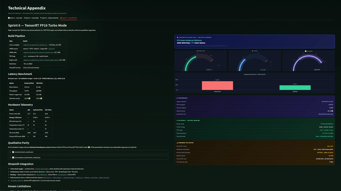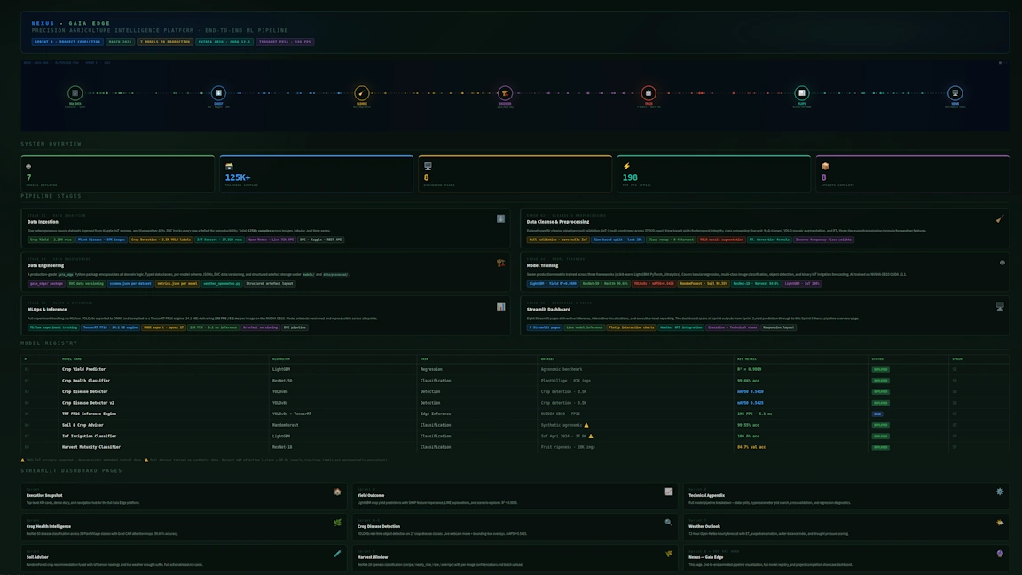 Sprint 1–8 culminate in a unified precision agriculture intelligence stack. We combined computer vision, IoT soil telemetry, Open-Meteo weather integration, yield modelling, and harvest maturity prediction into a cohesive pipeline — fully surfaced through an interactive Streamlit interface and visualised via the Nexus pipeline viewer. The result is a production-ready blueprint for AI-driven farming systems: scalable, GPU-accelerated, and purpose-built for intelligent decision-making at the edge.